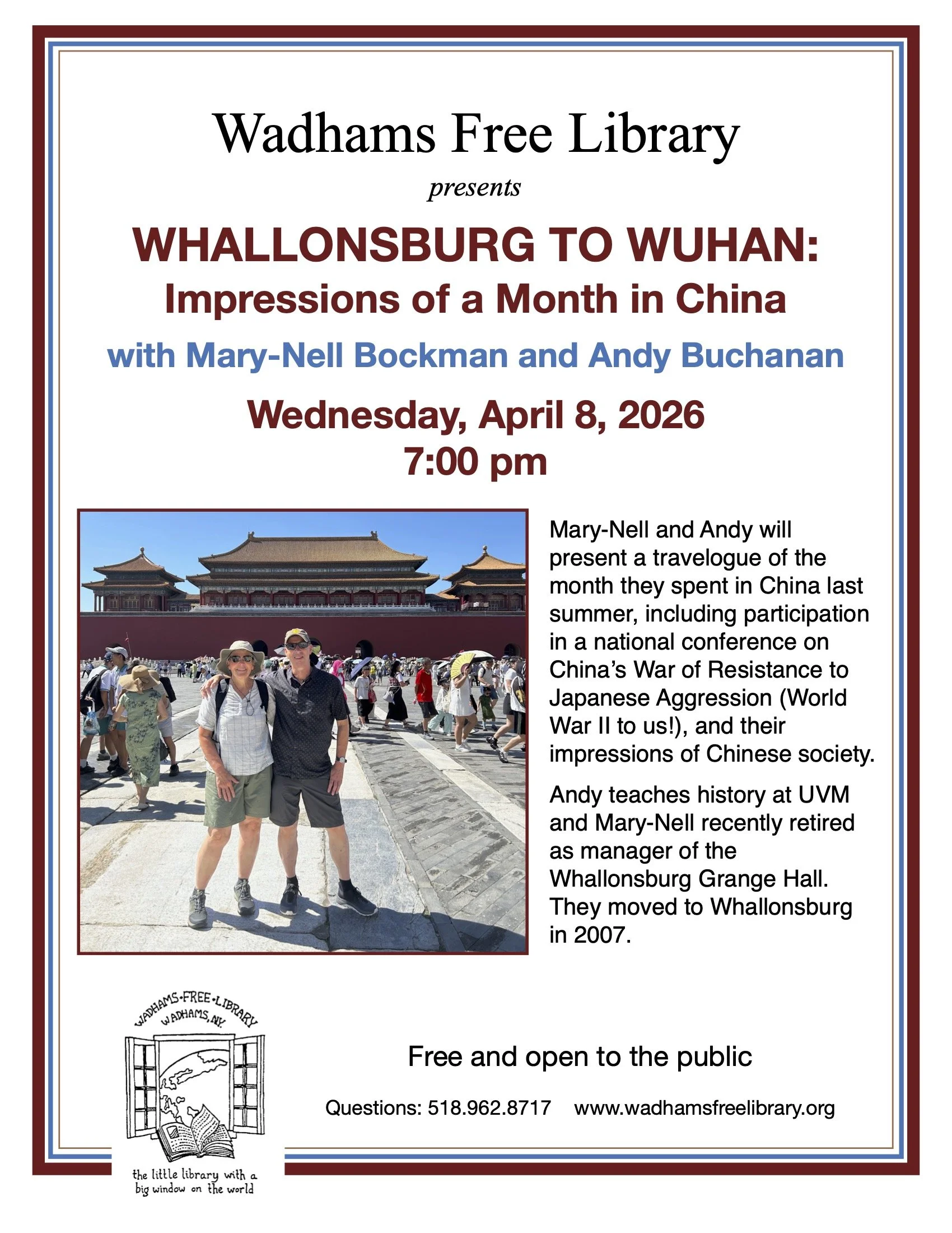Wednesday at Wadhams Free Library at 7:00pm