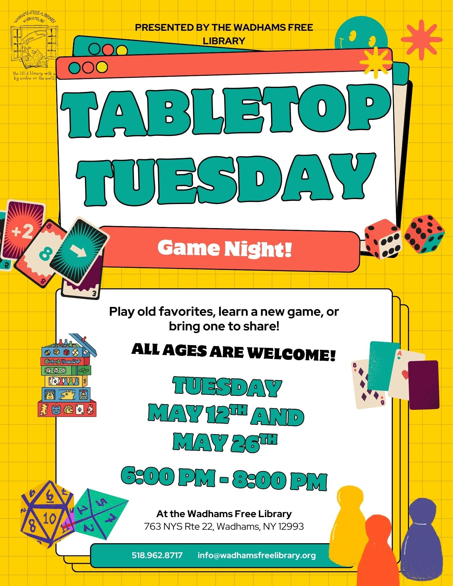 TABLETOP TUESDAY - May 14 Tuesday, May 12, 2026 6:00 PM 8:00 PM 18:00 20:00 Wadhams Free Library 763 New York 22 Westport, NY, 12993 United States (map) Google Calendar ICS