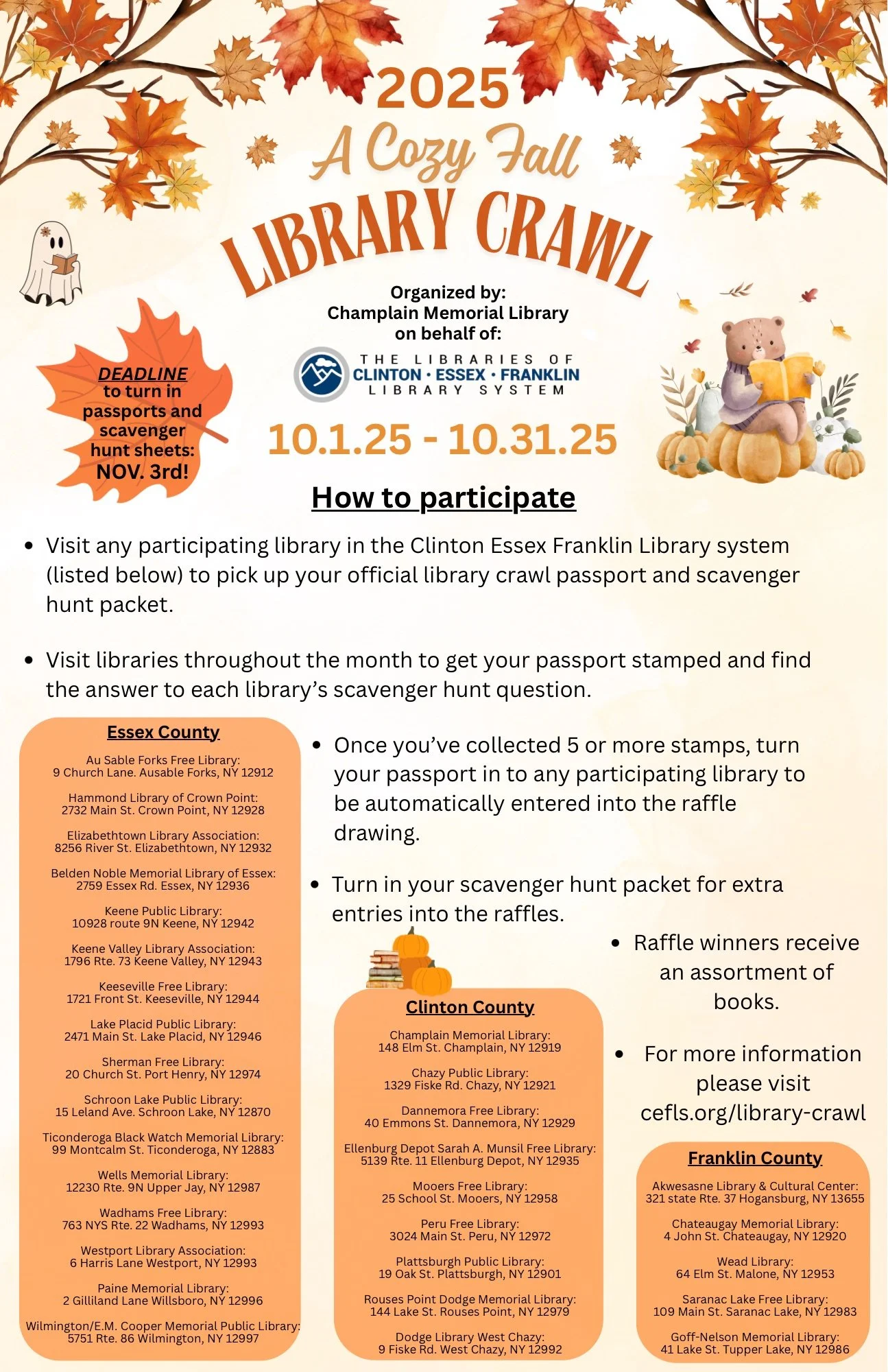 Visit any participating library in the Clinton-Essex-Franklin Library System to pick up your official library crawl passport and scavenger hunt packet.